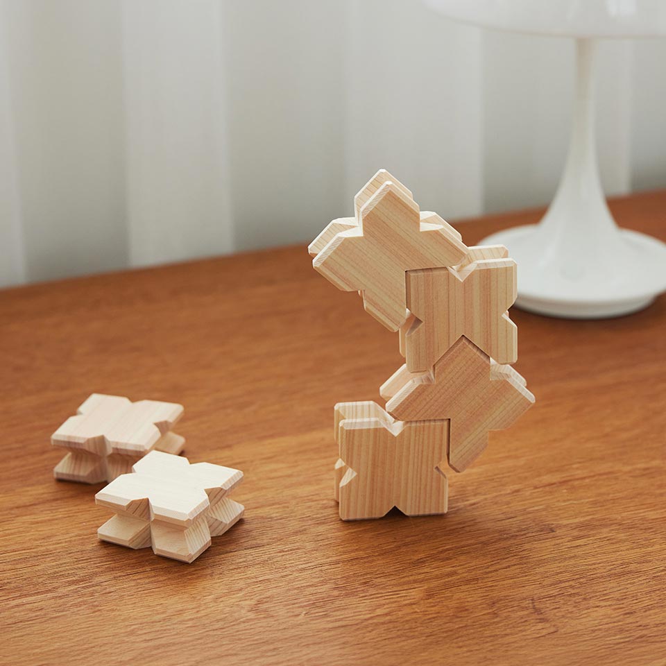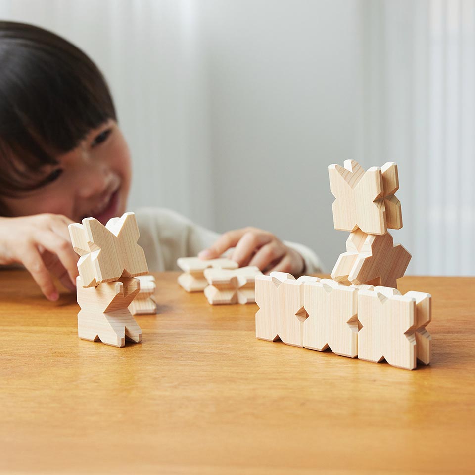 『KIKKA』は、積み方、遊び方に「定石」がないのがいいところ。遊びながら試行錯誤をしたり、うまく組み立てられて喜んだりする時間から、「考える力」が育ちます。また、天然木ならではの手触りと香りに触ることで、豊かな五感や「感じる力」も育まれるはず。小さいお子さんたちが手に取りやすいサイズと軽さで、気軽に遊びの世界に入れるのも魅力です。